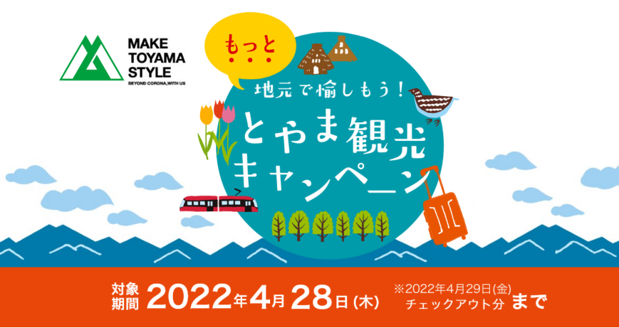 「地元で愉しもう!とやま観光キャンペーン」は2022年10月10日をもって終了しました。今後、期間延長や予算追加の情報があれば改めてこちらのページでご紹介致します。