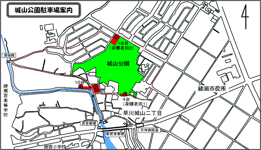 城山公園には計4か所、112台分の駐車スペースがあります。下の写真は城山公園北側にある48台の駐車場を撮影した物です。この日は平日だったので休日の桜シーズンになるとすぐに満車になってしま感じです。綾瀬市ホームページより