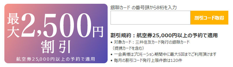 三井住友銀聯カードで最大2,500円OFF